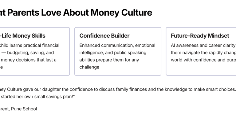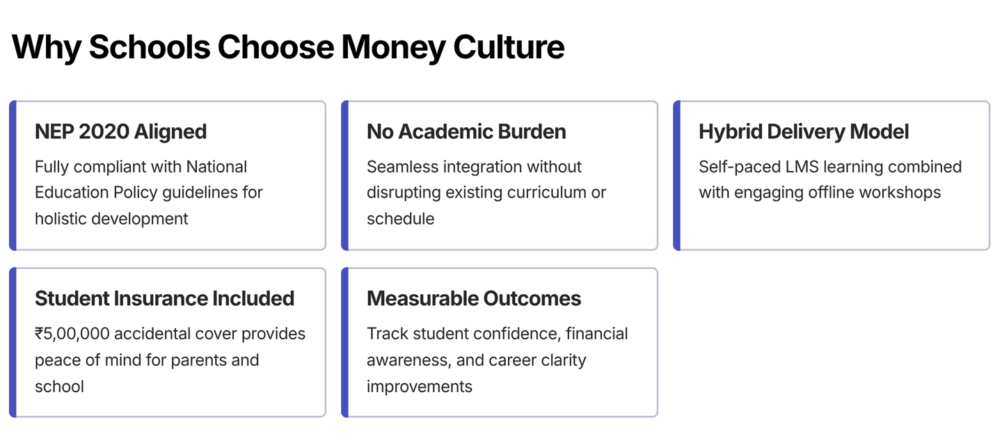 We aim to bridge the gap between traditional education and real-world readiness by integrating financial education, digital literacy, and personality development into the school ecosystem. Our mission is to equip students with practical knowledge, responsible thinking, and the confidence to navigate money, technology, and life effectively.