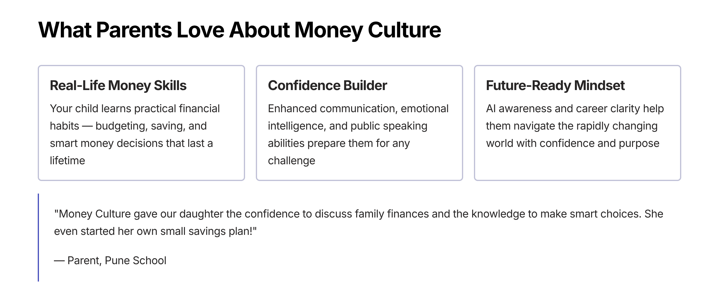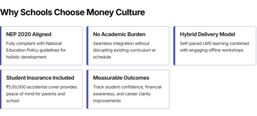 We envision an education system where students are not only academically capable but also financially aware, technologically confident, and emotionally strong. Our goal is to make life skills an essential part of mainstream education, enabling every student to navigate money, technology, and career choices with clarity and confidence.